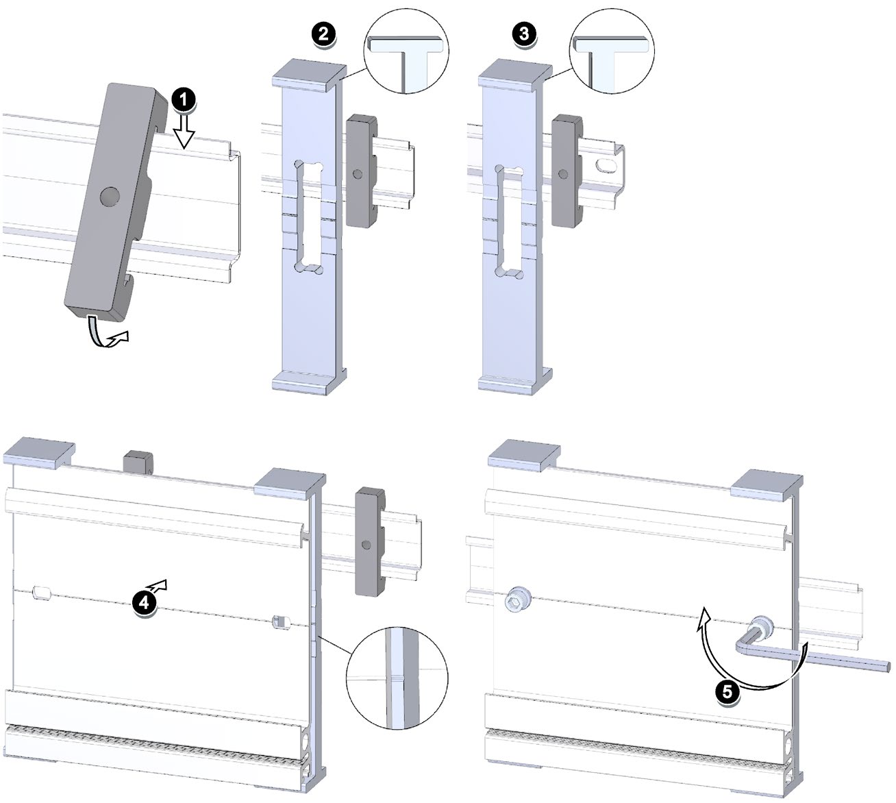 Şekil 5 - DIN rayı adaptörünün DIN rayına montaj sırası 35 mm x 7.5 mm veya 35 mm x 15 mm