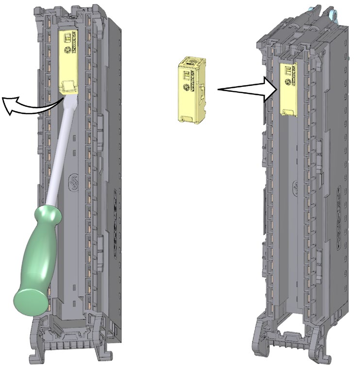 Ön konektör F modülüne takıldığında, elektronik kodlama elemanı tamamen ön konektöre geçer. Ön konektörü F modülünden çıkarırsanız, arıza korumalı modülün PROFIsafe adresine sahip bellek ön konektörde kalır.